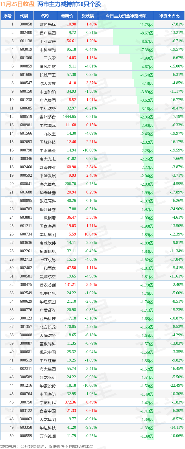 两市主力减持最多的前十只个股为: