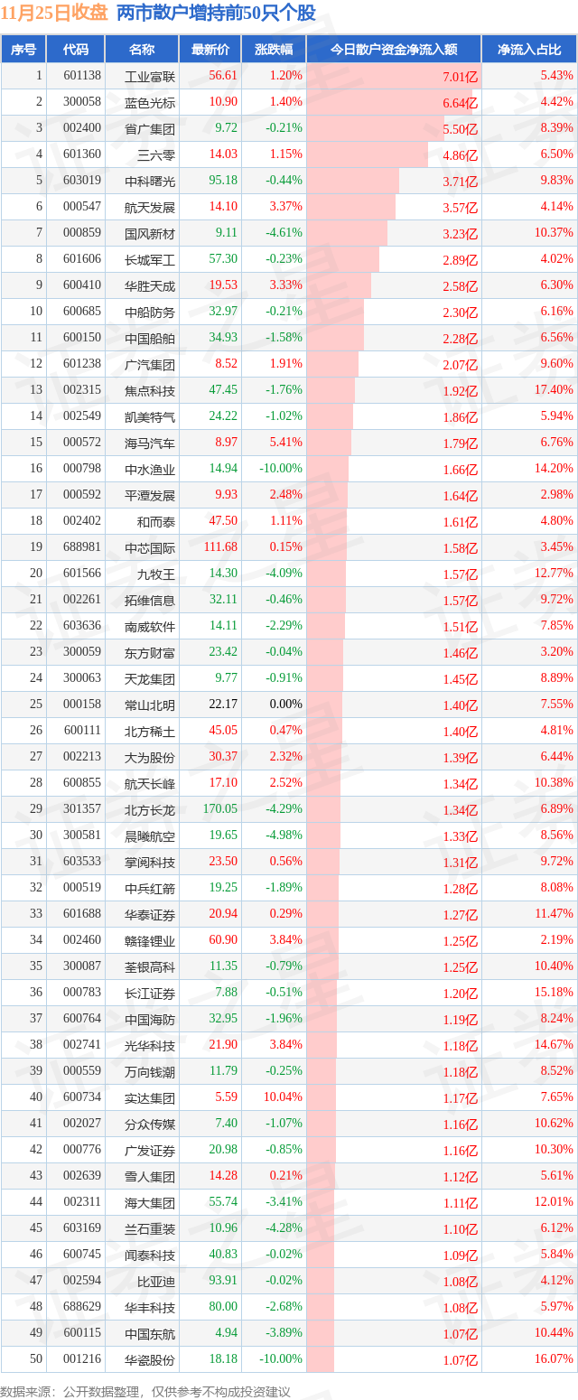 两市散户增持最多的前十只个股为: