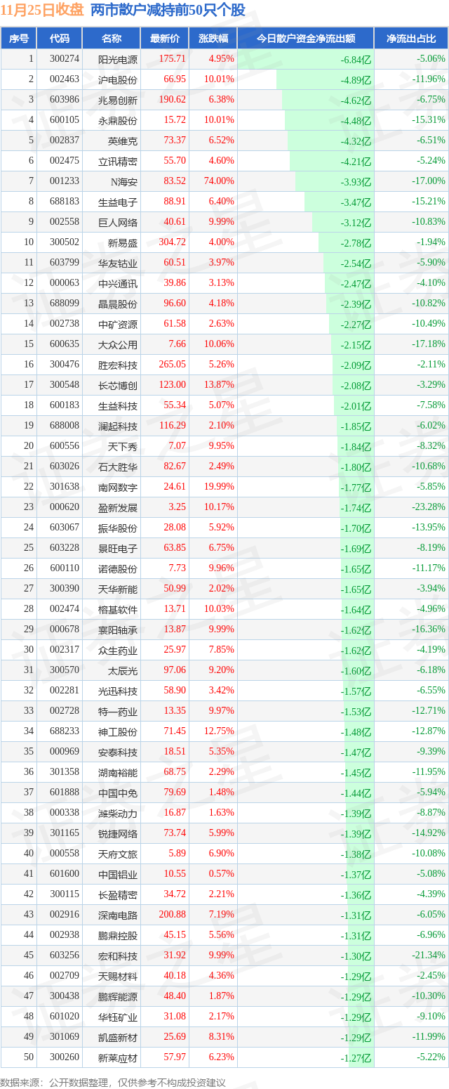 两市散户减持最多的前十只个股为: