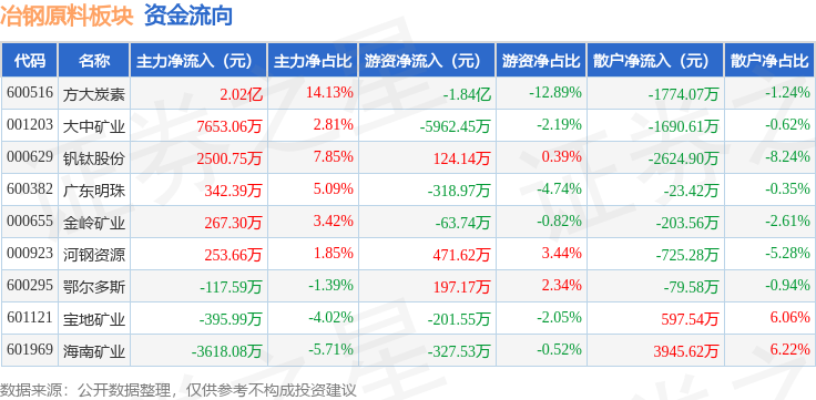 从资金流向上来看,当日冶钢原料板块主力资金净流入2.71亿元,游资资金净流出2.45亿元,散户资金净流出2578.27万元。冶钢原料板块个股资金流向见下表: