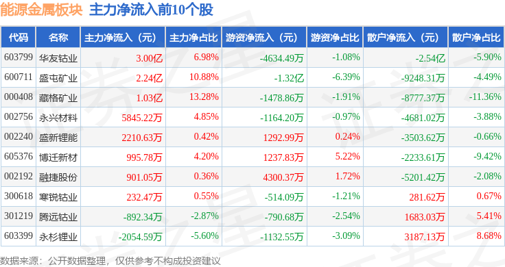 从资金流向上来看,当日能源金属板块主力资金净流入3.93亿元,游资资金净流入2508.67万元,散户资金净流出4.18亿元。能源金属板块个股资金流向见下表: