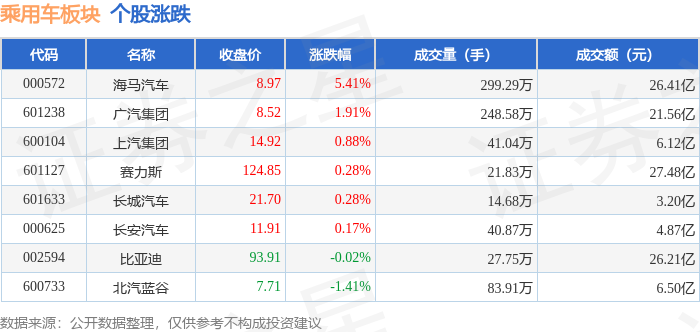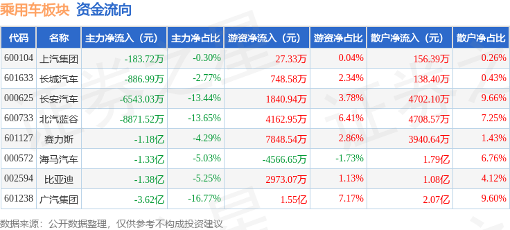从资金流向上来看,当日乘用车板块主力资金净流出9.15亿元,游资资金净流入2.85亿元,散户资金净流入6.3亿元。乘用车板块个股资金流向见下表: