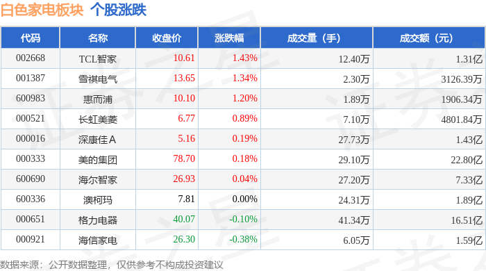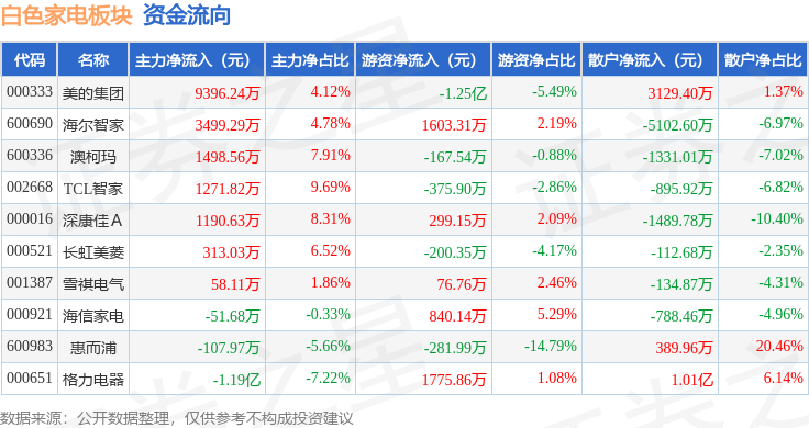 从资金流向上来看,当日白色家电板块主力资金净流入5153.87万元,游资资金净流出8956.2万元,散户资金净流入3802.33万元。白色家电板块个股资金流向见下表: