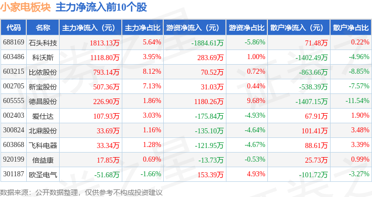 从资金流向上来看,当日小家电板块主力资金净流出769.42万元,游资资金净流入706.74万元,散户资金净流入62.68万元。小家电板块个股资金流向见下表: