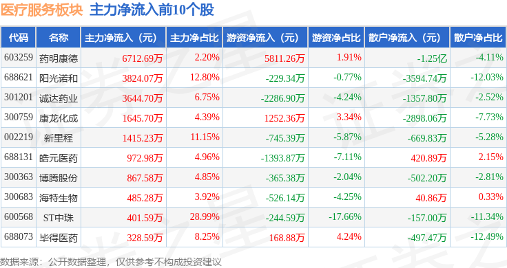 从资金流向上来看,当日医疗服务板块主力资金净流出1.13亿元,游资资金净流入8265.75万元,散户资金净流入3037.18万元。医疗服务板块个股资金流向见下表:
