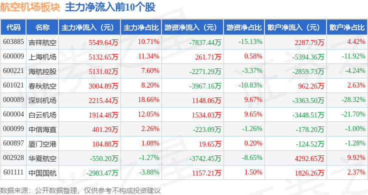 从资金流向上来看,当日航空机场板块主力资金净流入1.05亿元,游资资金净流出2.46亿元,散户资金净流入1.41亿元。航空机场板块个股资金流向见下表: