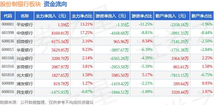 从资金流向上来看,当日股份制银行板块主力资金净流入4.23亿元,游资资金净流出2.74亿元,散户资金净流出1.49亿元。股份制银行板块个股资金流向见下表: