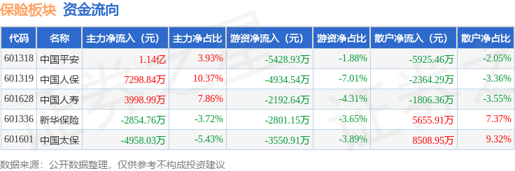 从资金流向上来看,当日保险板块主力资金净流入1.48亿元,游资资金净流出1.89亿元,散户资金净流入4068.74万元。保险板块个股资金流向见下表: