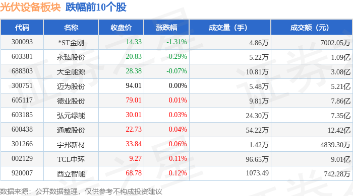 从资金流向上来看,当日光伏设备板块主力资金净流入13.17亿元,游资资金净流出2.75亿元,散户资金净流出10.41亿元。光伏设备板块个股资金流向见下表:
