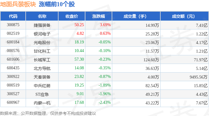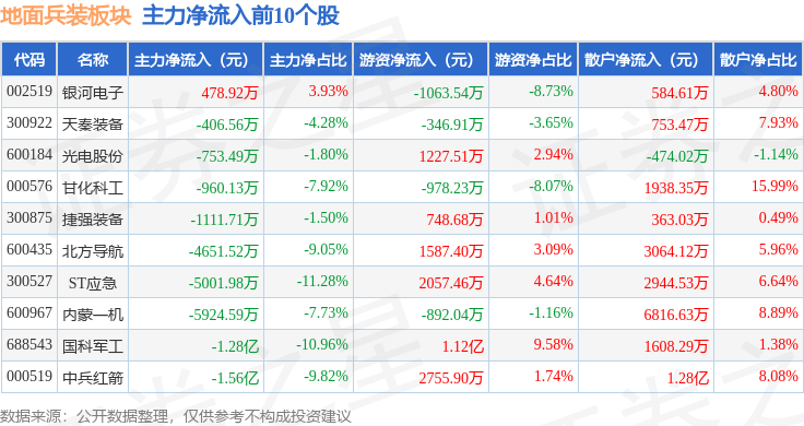 从资金流向上来看,当日地面兵装板块主力资金净流出10.86亿元,游资资金净流入3.59亿元,散户资金净流入7.27亿元。地面兵装板块个股资金流向见下表: