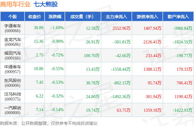 个股表现方面,商用车行业当日领跌股为宇通客车(600066),该股当日报收30.89,下跌1.69%,成交量12.58万,主力资金净流入2552.9万元。金龙汽车(600686)以下跌0.9%紧随其后,该股当日成交量26.91万,主力资金净流出301.81万元。除此之外,福田汽车(600166)、中通客车(000957)、东风股份(600006)均进入当日熊股之列。具体个股列表见下表: