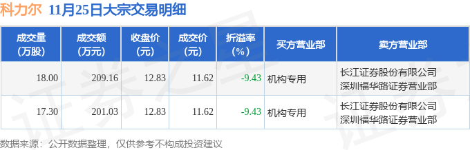 证券之星消息,11月25日科力尔发生大宗交易,交易数据如下: