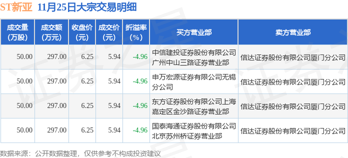 证券之星消息,11月25日ST新亚发生大宗交易,交易数据如下: