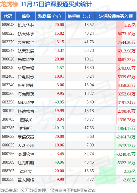 龙虎榜中有沪股通/深股通专用席位(北向资金)现身的个股共19家,其中长光华芯以净买入1.19亿元排名第一。详情见下表: