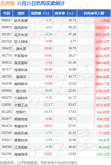 当日公布的交易所龙虎榜中有机构专用席位现身的个股共35家,其中航天发展以净买入1.47亿元排名第一。详情见下表: