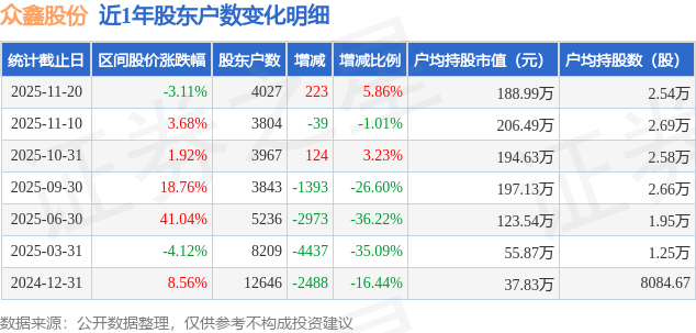 从股价来看,2025年11月10日至2025年11月20日,众鑫股份区间跌幅为3.11%,在此期间股东户数增加223.0户,增幅为5.86%。