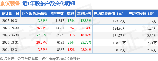 从股价来看,2025年9月30日至2025年10月31日,京仪装备区间跌幅为13.81%,在此期间股东户数减少1744.0户,减幅为12.86%。
