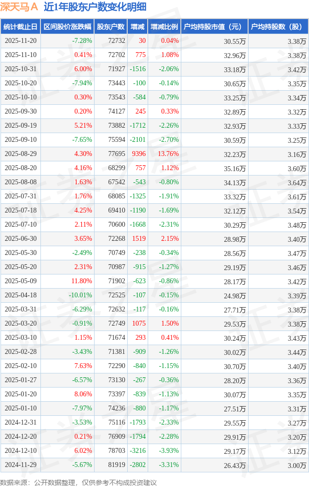从股价来看,2025年11月10日至2025年11月20日,深天马A区间跌幅为7.28%,在此期间股东户数增加30.0户,增幅为0.04%。