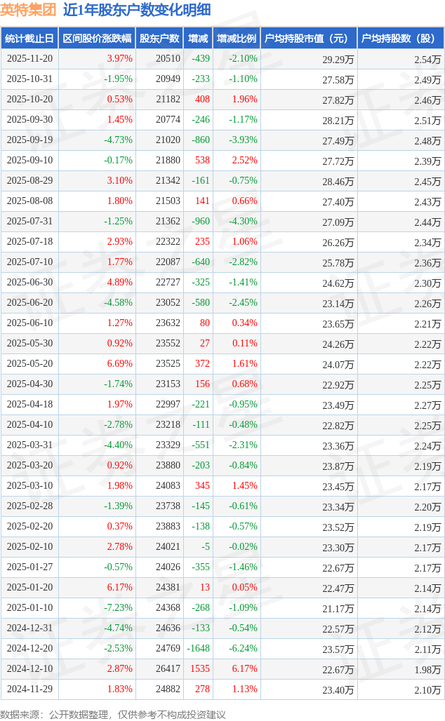 从股价来看,2025年10月31日至2025年11月20日,英特集团区间涨幅为3.97%,在此期间股东户数减少439.0户,减幅为2.1%。