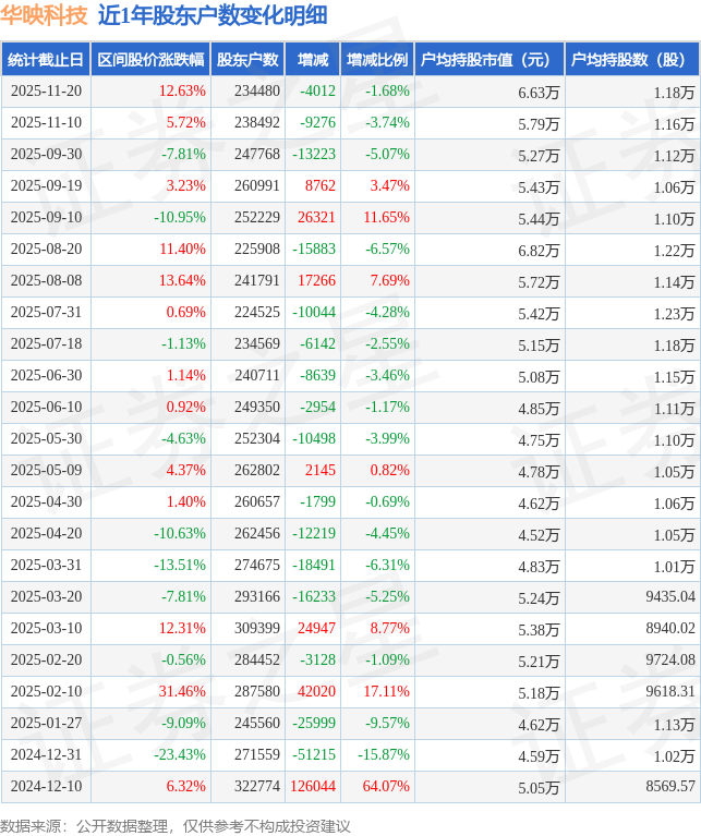 从股价来看,2025年11月10日至2025年11月20日,华映科技区间涨幅为12.63%,在此期间股东户数减少4012.0户,减幅为1.68%。