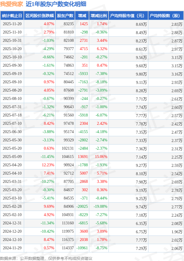 证券之星消息,近日我爱我家披露,截至2025年11月20日公司股东户数为8.32万户,较11月10日增加1425.0户,增幅为1.74%。户均持股数量由上期的2.88万股减少至2.83万股,户均持股市值为8.69万元。