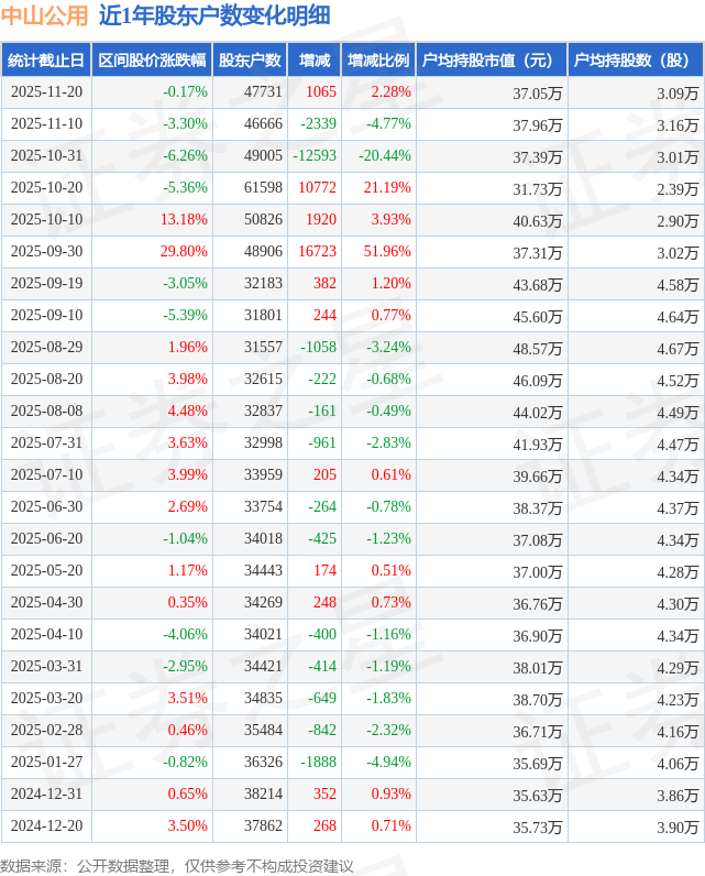从股价来看,2025年11月10日至2025年11月20日,中山公用区间跌幅为0.17%,在此期间股东户数增加1065.0户,增幅为2.28%。