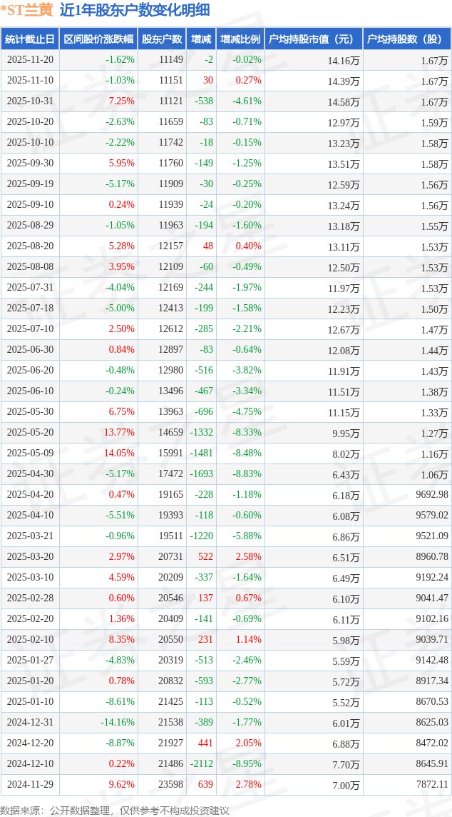 从股价来看,2025年11月10日至2025年11月20日,*ST兰黄区间跌幅为1.62%,在此期间股东户数减少2.0户,减幅为0.02%。