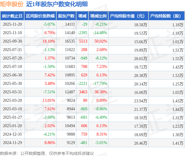 从股价来看,2025年11月10日至2025年11月20日,炬申股份区间跌幅为5.07%,在此期间股东户数减少29.0户,减幅为0.21%。