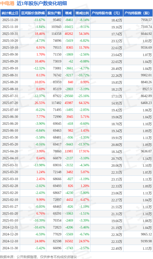 从股价来看,2025年11月10日至2025年11月20日,中电港区间跌幅为11.67%,在此期间股东户数减少8461.0户,减幅为8.14%。