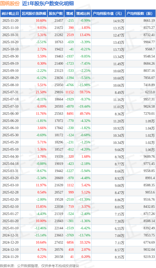 从股价来看,2025年11月10日至2025年11月20日,国统股份区间涨幅为10.6%,在此期间股东户数减少215.0户,减幅为0.99%。