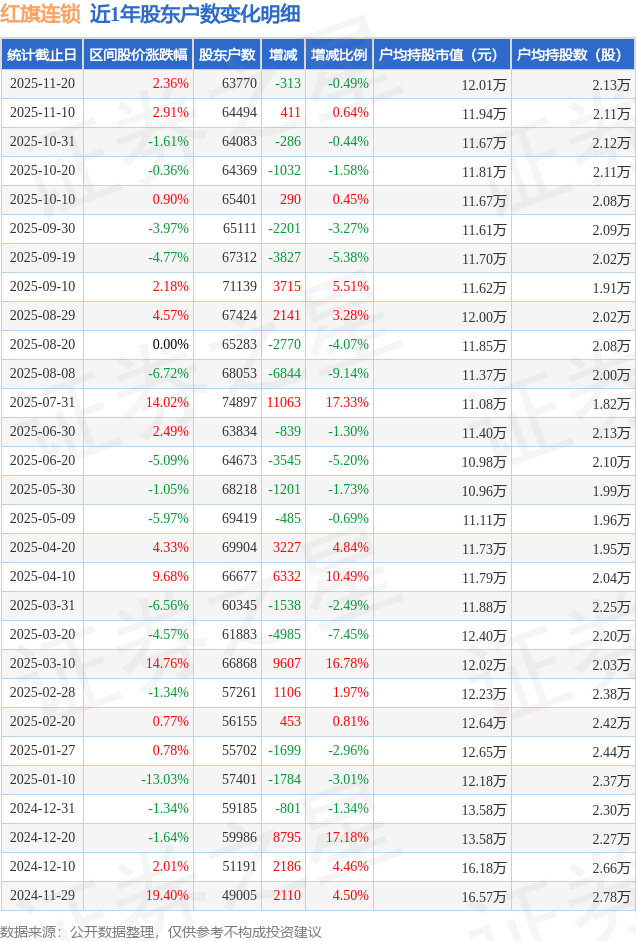 从股价来看,2025年10月31日至2025年11月20日,红旗连锁区间涨幅为2.36%,在此期间股东户数减少313.0户,减幅为0.49%。