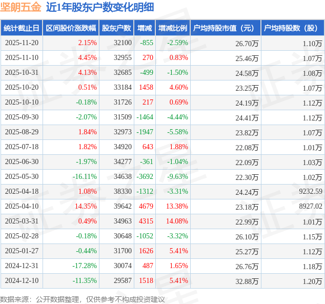 从股价来看,2025年11月10日至2025年11月20日,坚朗五金区间涨幅为2.15%,在此期间股东户数减少855.0户,减幅为2.59%。