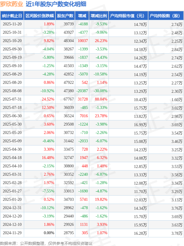 从股价来看,2025年10月31日至2025年11月20日,罗欣药业区间涨幅为1.89%,在此期间股东户数减少4188.0户,减幅为9.53%。