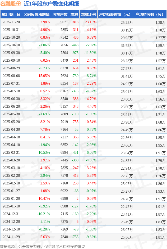 从股价来看,2025年10月31日至2025年11月20日,名雕股份区间涨幅为2.98%,在此期间股东户数增加1818.0户,增幅为23.15%。