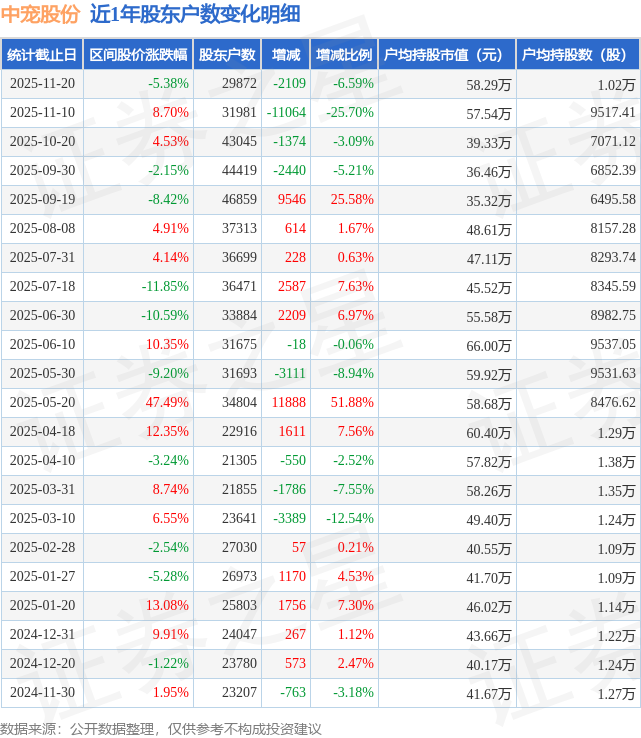 从股价来看,2025年11月10日至2025年11月20日,中宠股份区间跌幅为5.38%,在此期间股东户数减少2109.0户,减幅为6.59%。