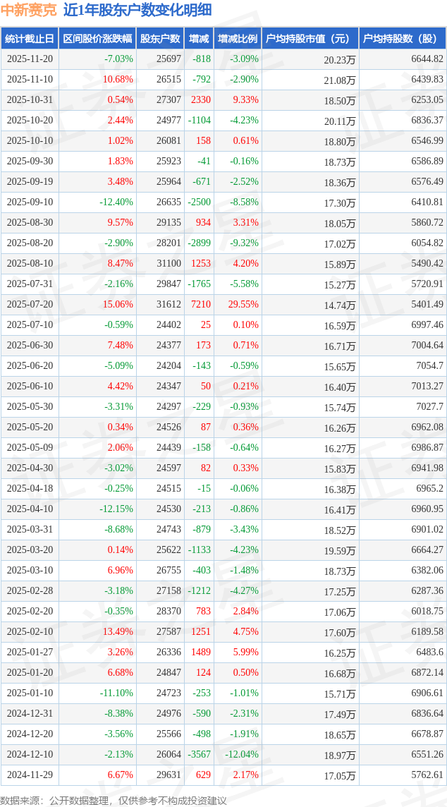 从股价来看,2025年11月10日至2025年11月20日,中新赛克区间跌幅为7.03%,在此期间股东户数减少818.0户,减幅为3.09%。