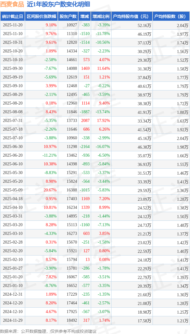 从股价来看,2025年11月10日至2025年11月20日,西麦食品区间涨幅为9.1%,在此期间股东户数减少383.0户,减幅为3.39%。