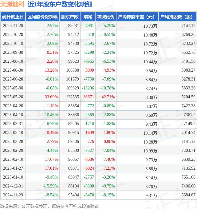 从股价来看,2025年10月20日至2025年11月20日,天源迪科区间跌幅为2.97%,在此期间股东户数减少4981.0户,减幅为5.29%。