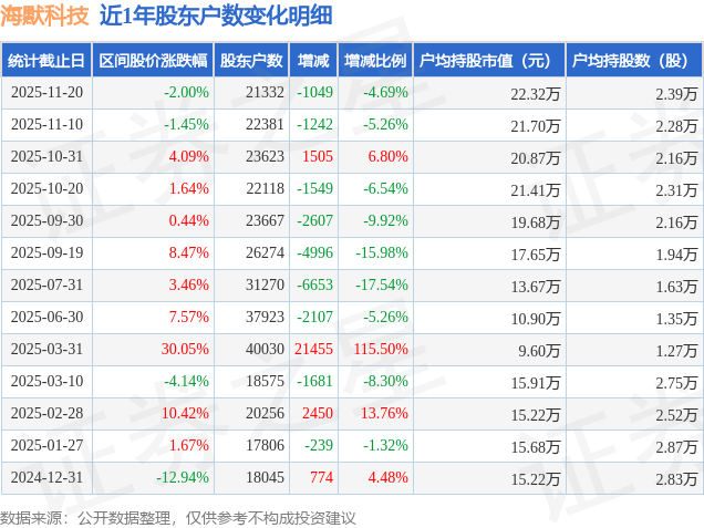从股价来看,2025年11月10日至2025年11月20日,海默科技区间跌幅为2.0%,在此期间股东户数减少1049.0户,减幅为4.69%。