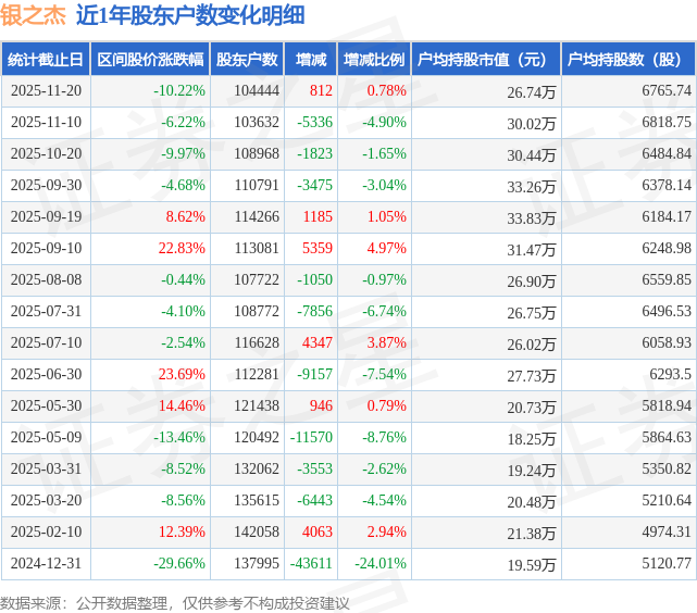 从股价来看,2025年11月10日至2025年11月20日,银之杰区间跌幅为10.22%,在此期间股东户数增加812.0户,增幅为0.78%。
