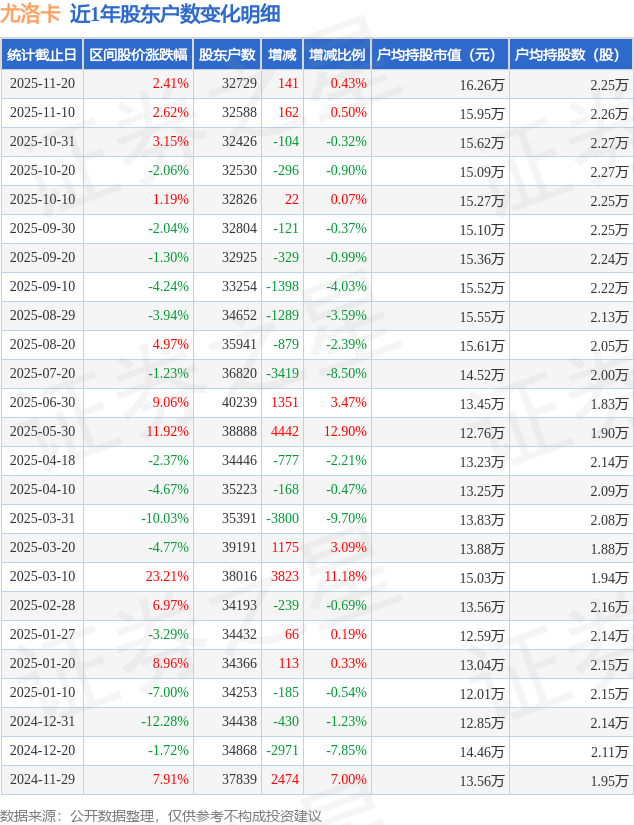 从股价来看,2025年11月10日至2025年11月20日,尤洛卡区间涨幅为2.41%,在此期间股东户数增加141.0户,增幅为0.43%。