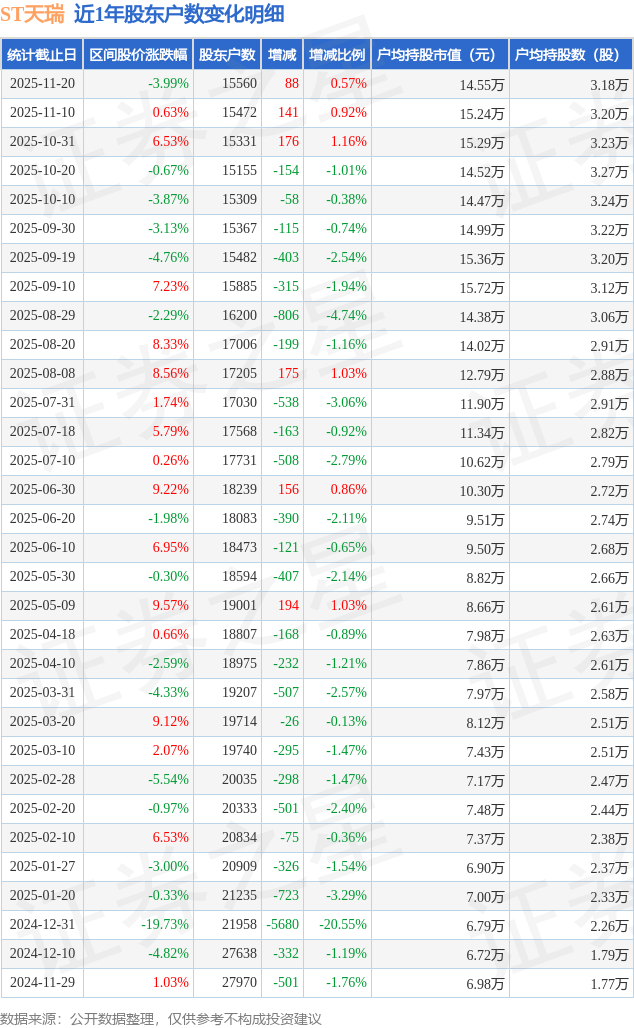 从股价来看,2025年11月10日至2025年11月20日,ST天瑞区间跌幅为3.99%,在此期间股东户数增加88.0户,增幅为0.57%。