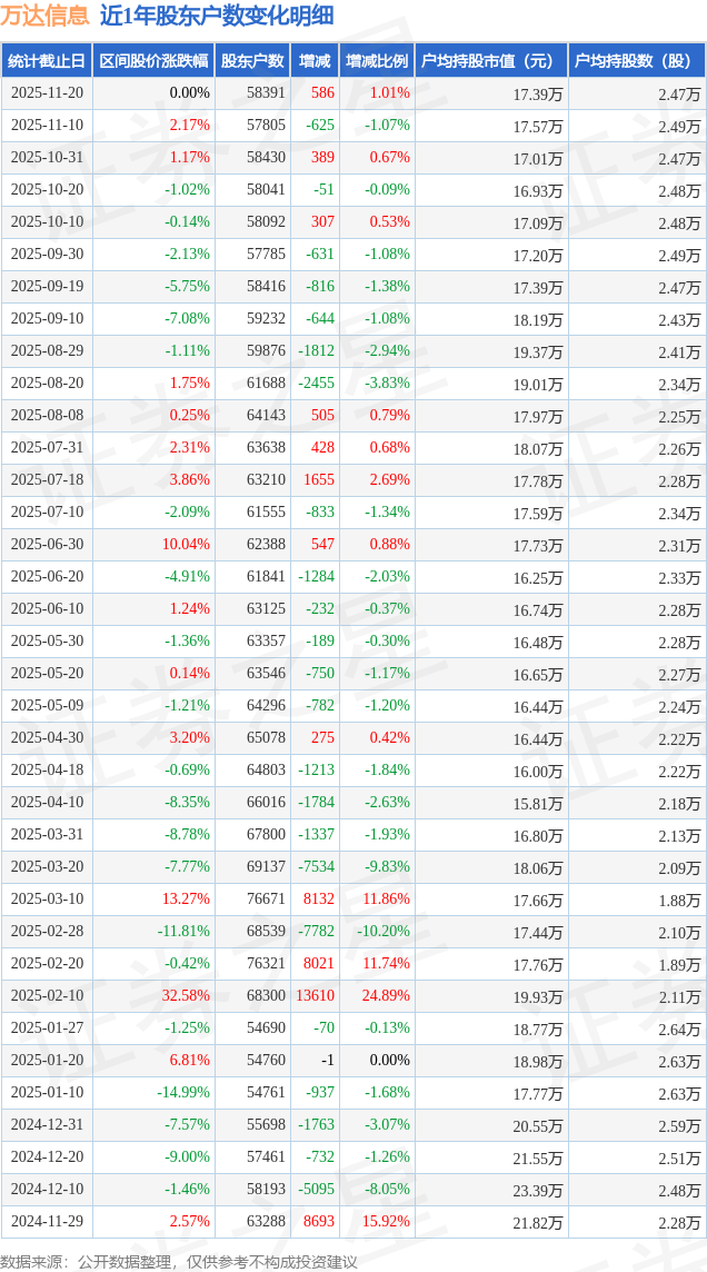 从股价来看,2025年11月10日至2025年11月20日,万达信息区间跌幅为0.0%,在此期间股东户数增加586.0户,增幅为1.01%。