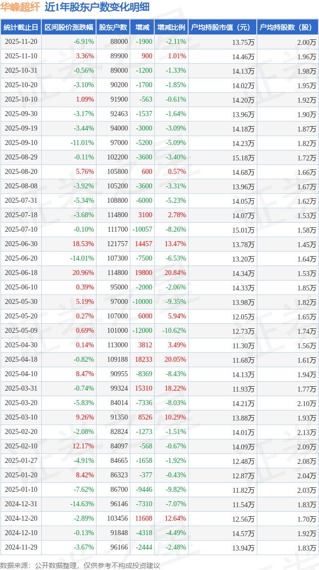 从股价来看,2025年11月10日至2025年11月20日,华峰超纤区间跌幅为6.91%,在此期间股东户数减少1900.0户,减幅为2.11%。