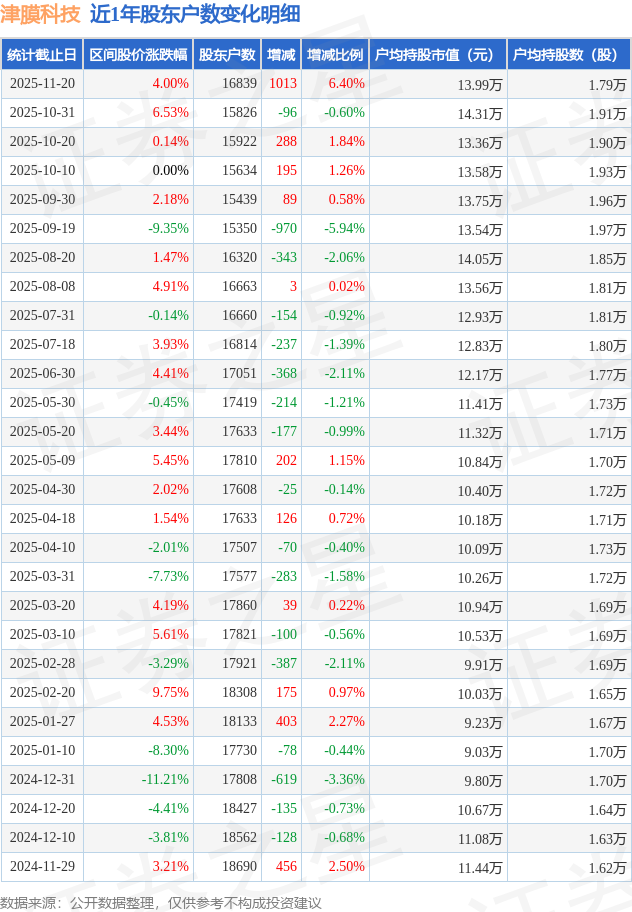 从股价来看,2025年10月31日至2025年11月20日,津膜科技区间涨幅为4.0%,在此期间股东户数增加1013.0户,增幅为6.4%。