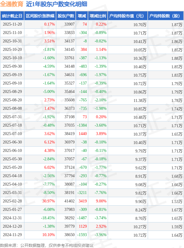 从股价来看,2025年11月10日至2025年11月20日,全通教育区间涨幅为0.17%,在此期间股东户数增加74.0户,增幅为0.22%。