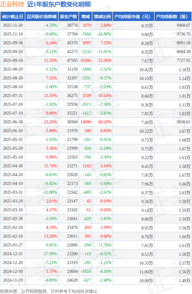 从股价来看,2025年11月10日至2025年11月20日,正业科技区间跌幅为4.76%,在此期间股东户数增加1070.0户,增幅为2.84%。