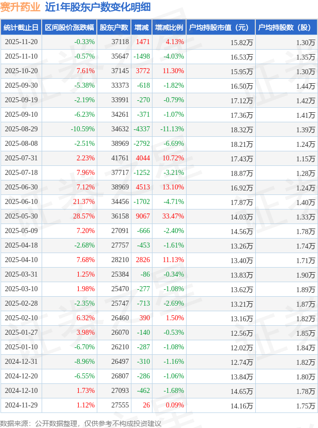 从股价来看,2025年11月10日至2025年11月20日,赛升药业区间跌幅为0.33%,在此期间股东户数增加1471.0户,增幅为4.13%。