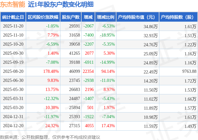 从股价来看,2025年11月10日至2025年11月20日,东杰智能区间跌幅为1.05%,在此期间股东户数减少2067.0户,减幅为6.53%。