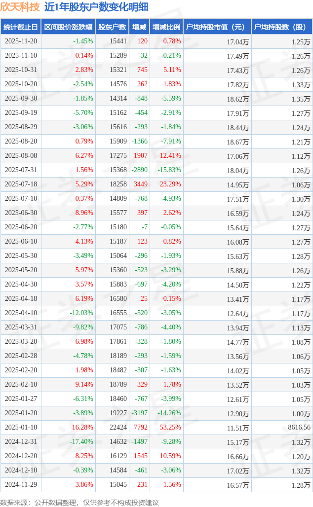 从股价来看,2025年10月31日至2025年11月20日,欣天科技区间跌幅为1.45%,在此期间股东户数增加120.0户,增幅为0.78%。